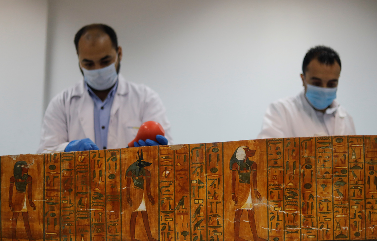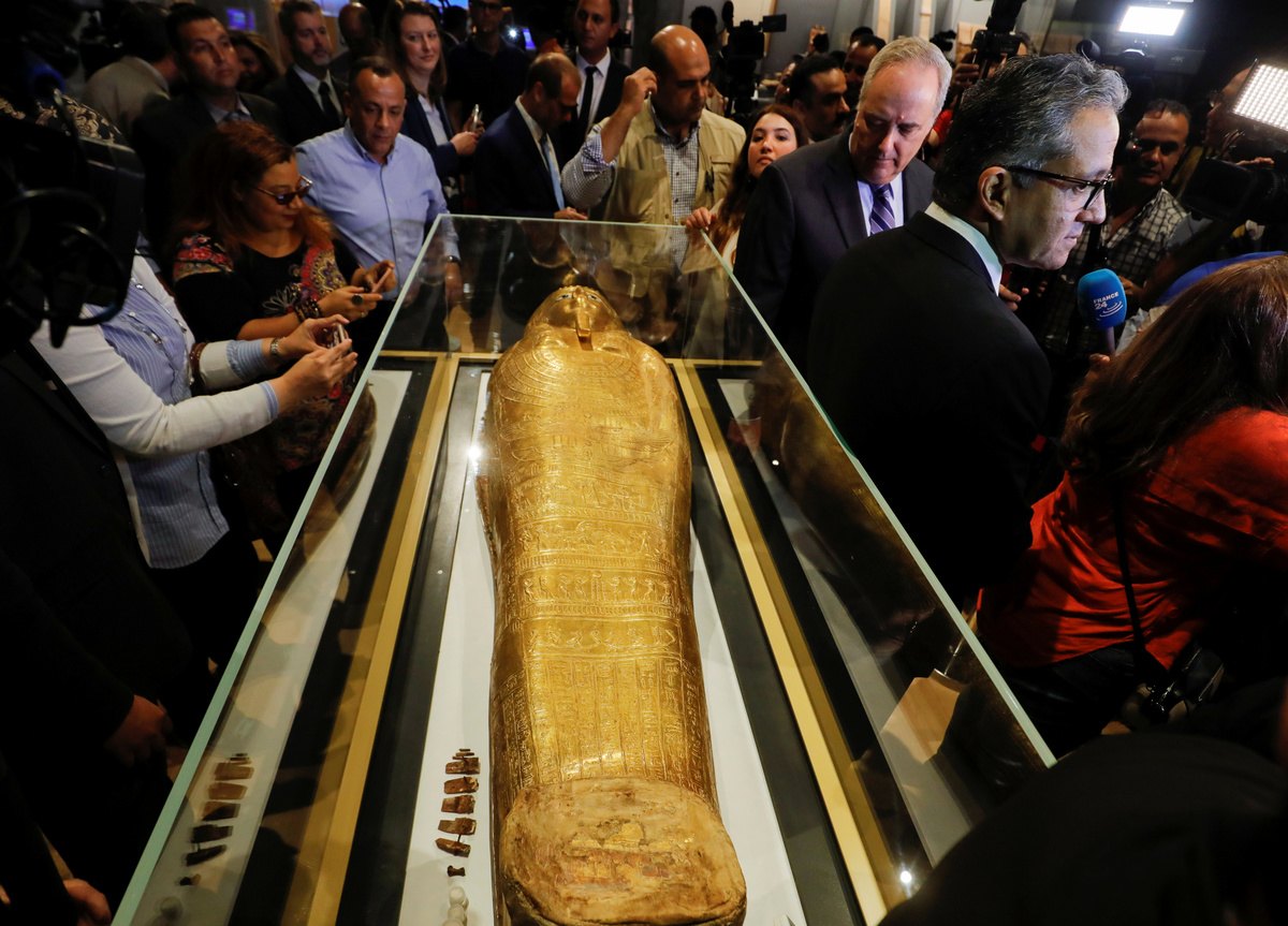 The Gold Coffin of Nedjemankh is displayed during a news conference to announce its return from the U.S. and display at the National Museum of Egyptian Civilization (NMEC) in Cairo, Egypt October 1, 2019. REUTERS/Amr Abdallah DalshEgyptian archaeological technicians work at the National Museum of Egyptian Civilization (NMEC) in Cairo, Egypt October 1, 2019. REUTERS/Amr Abdallah DalshThe Gold Coffin of Nedjemankh is displayed during a news conference to announce its return from the U.S. and display at the National Museum of Egyptian Civilization (NMEC) in Cairo, Egypt October 1, 2019. REUTERS/Amr Abdallah DalshEgypt's Antiquities Minister Khaled El-Enany and US Charge d'Affaires in Cairo Thomas Goldberger talk to media near the Gold Coffin of Nedjemankh during a news conference to announce its return from the U.S. and display at the National Museum of Egyptian Civilization (NMEC) in Cairo, Egypt October 1, 2019. REUTERS/Amr Abdallah DalshThe Gold Coffin of Nedjemankh is reflected near US Charge d'Affaires in Cairo Thomas Goldberger during a news conference to announce its return from the U.S. and display at the National Museum of Egyptian Civilization (NMEC) in Cairo, Egypt October 1, 2019. REUTERS/Amr Abdallah DalshEgypt's Antiquities Minister Khaled El-Enany and US Charge d'Affaires in Cairo Thomas Goldberger talk to media near the Gold Coffin of Nedjemankh during a news conference to announce its return from the U.S. and display at the National Museum of Egyptian Civilization (NMEC) in Cairo, Egypt October 1, 2019. REUTERS/Amr Abdallah DalshMembers of the media are seen around the Gold Coffin of Nedjemankh during a news conference to announce its return from the U.S. and display at the National Museum of Egyptian Civilization (NMEC) in Cairo, Egypt October 1, 2019. REUTERS/Amr Abdallah Dalsh