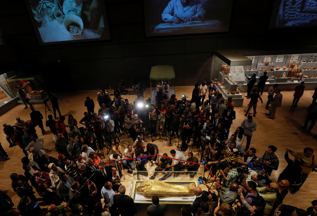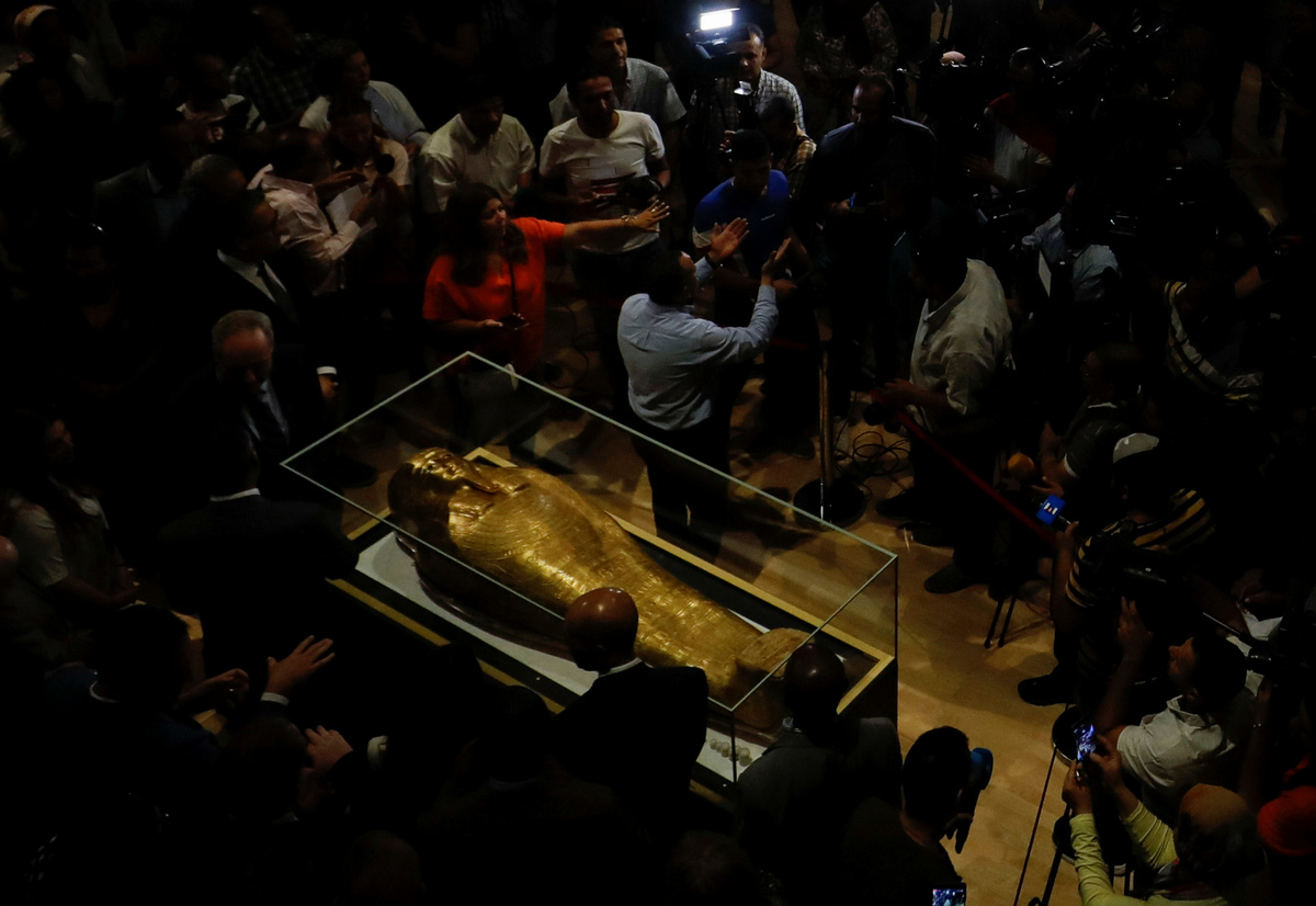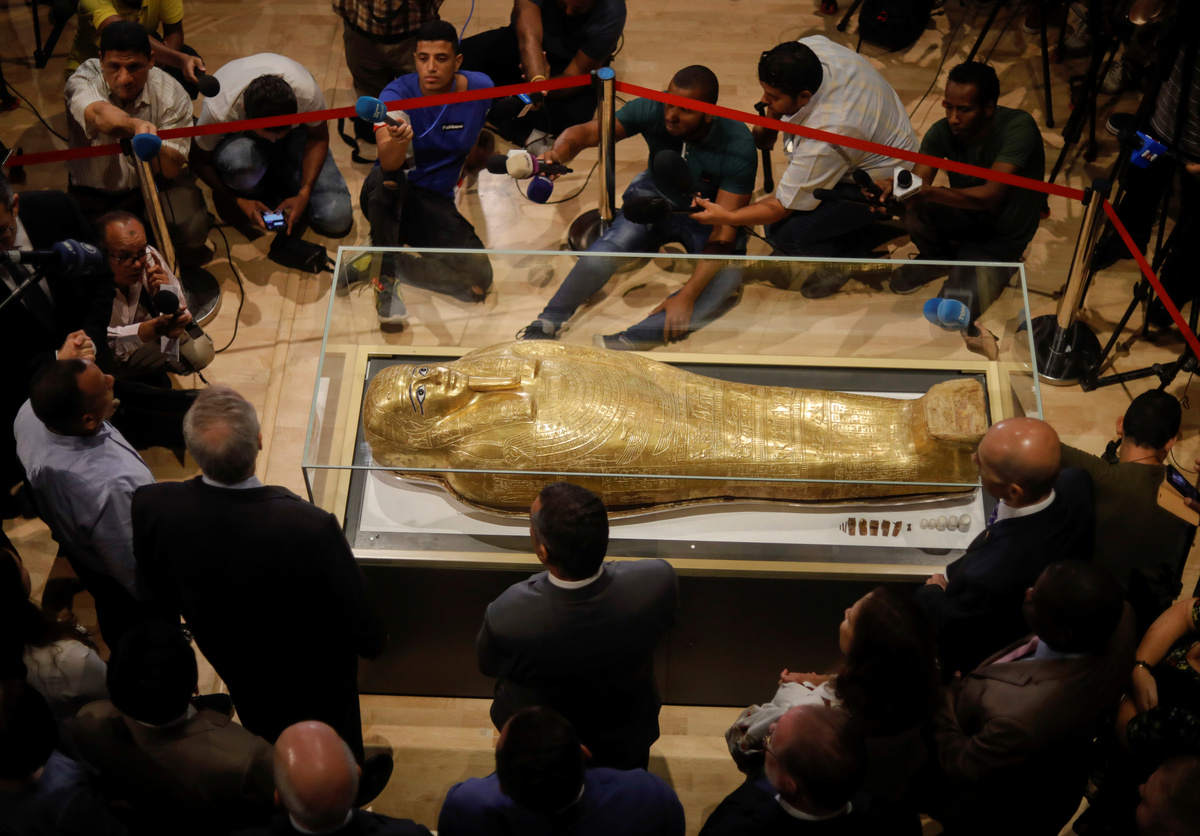 The Gold Coffin of Nedjemankh surrounded by members of media during a news conference to announce its return from the U.S. and display at the National Museum of Egyptian Civilization (NMEC) in Cairo, Egypt October 1, 2019. REUTERS/Amr Abdallah Dalsh