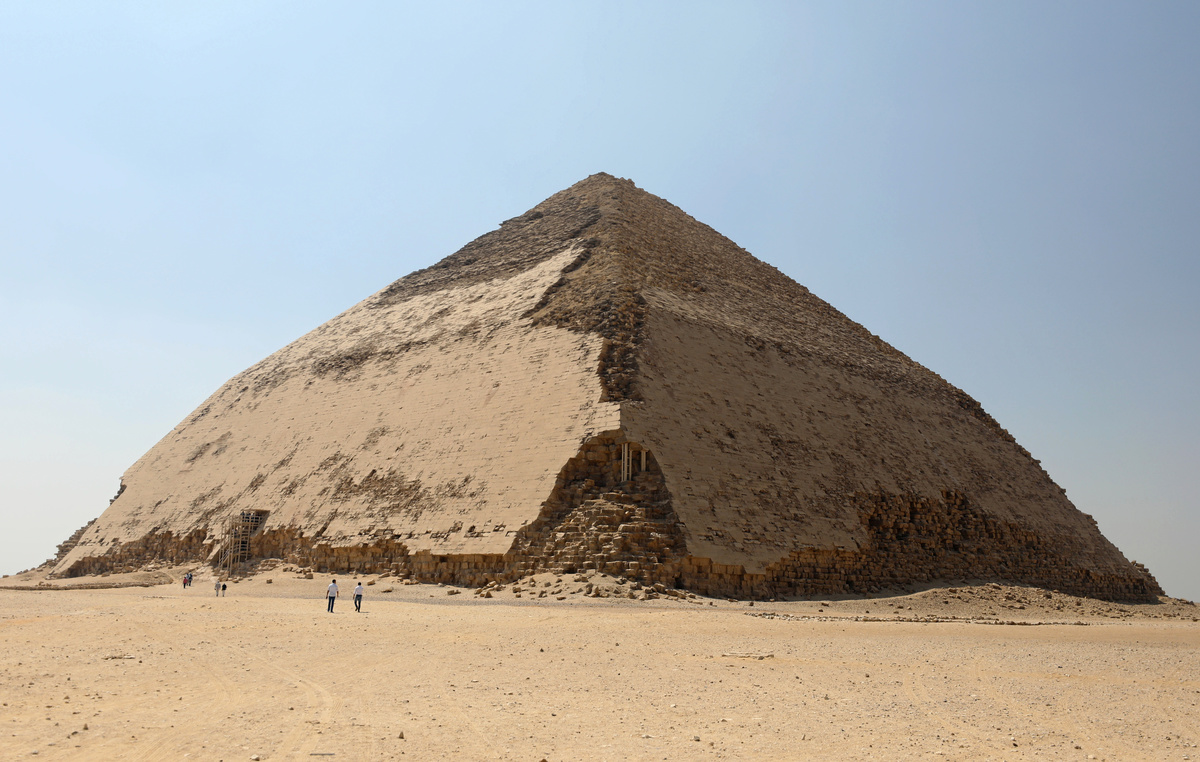 The angular shape contrasts with the straight sides of Sneferu's Red Pyramid just to the north, the first of ancient Egypt's fully formed pyramids and the next step toward the Great Pyramid of Giza.