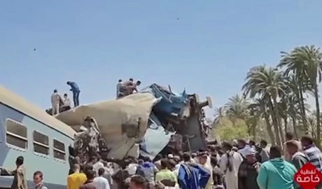 The transport ministry said that unknown persons pulled the emergency brake on a train going from Luxor to Alexandria, bringing it abruptly to a halt. Another train heading from Cairo to Aswan then crashed into it just before noon local time. The collision caused two cars from the first train to flip over.
