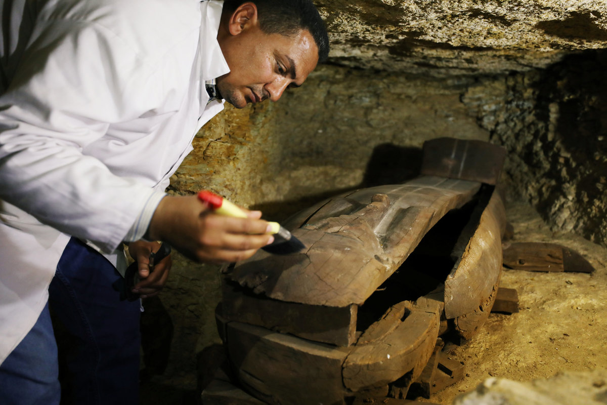 MINYA, Egypt (Reuters) - Egyptian archaeologists have discovered an ancient necropolis containing 40 stone sarcophagi, about 1,000 small statues and a necklace charm bearing the hieroglyphic inscription "happy new year".