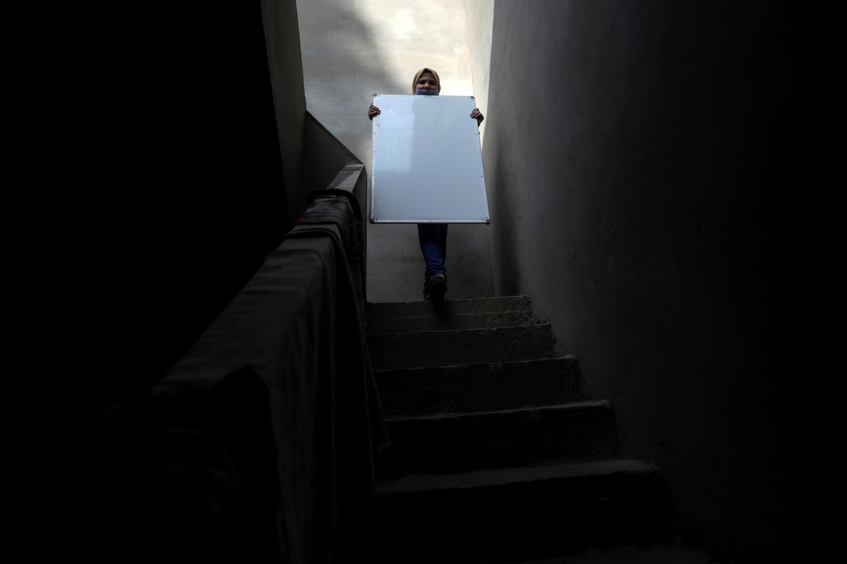 Reem El-Khouly, a 12-year-old girl, who teaches children in her neighborhood as schools remain closed during the coronavirus disease (COVID-19) pandemic, carries a board as she walks down the stairs at Atmida village in Dakahlia province, Egypt February 7, 2021. Picture taken February 7, 2021. REUTERS/Mohamed Abd El Ghany