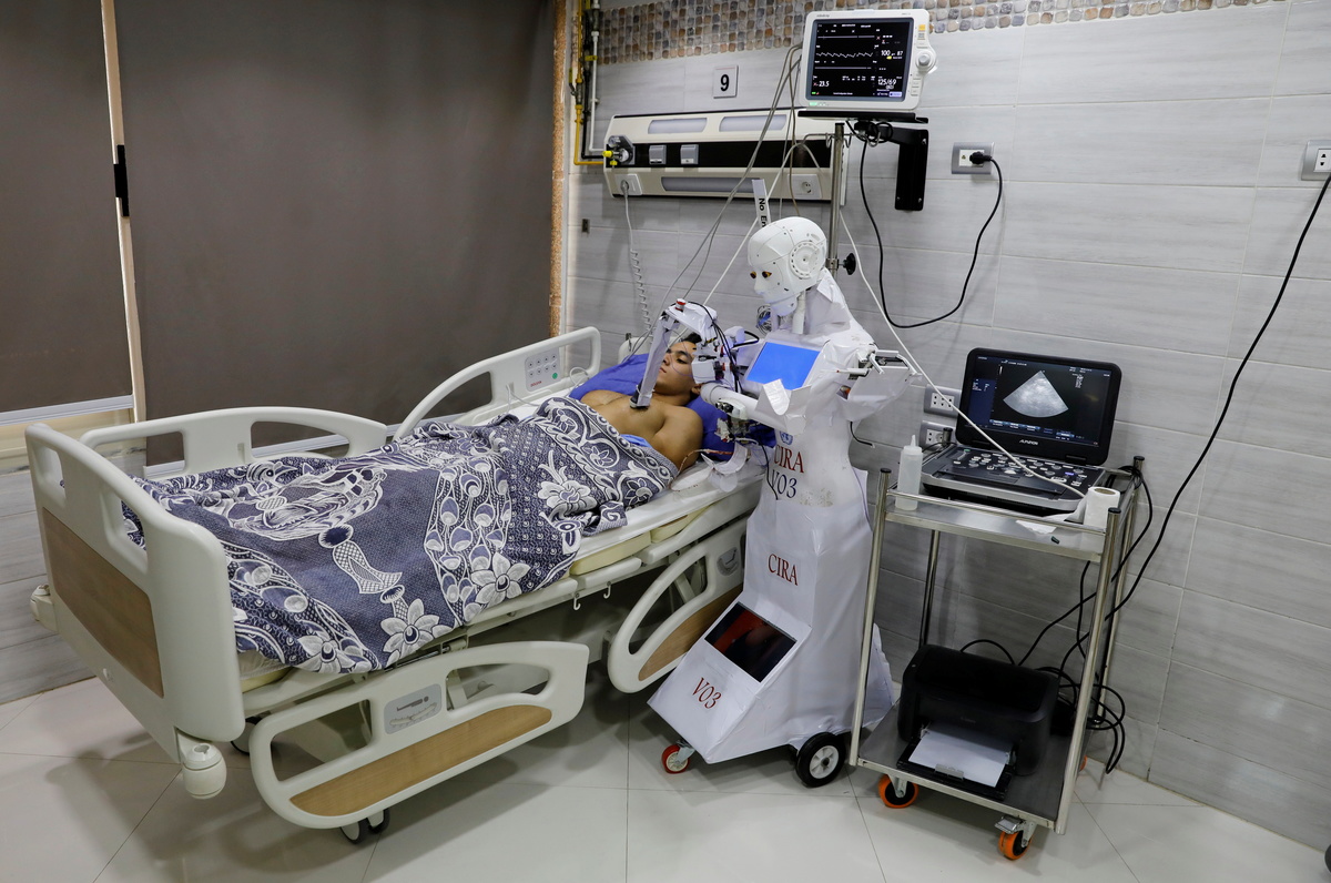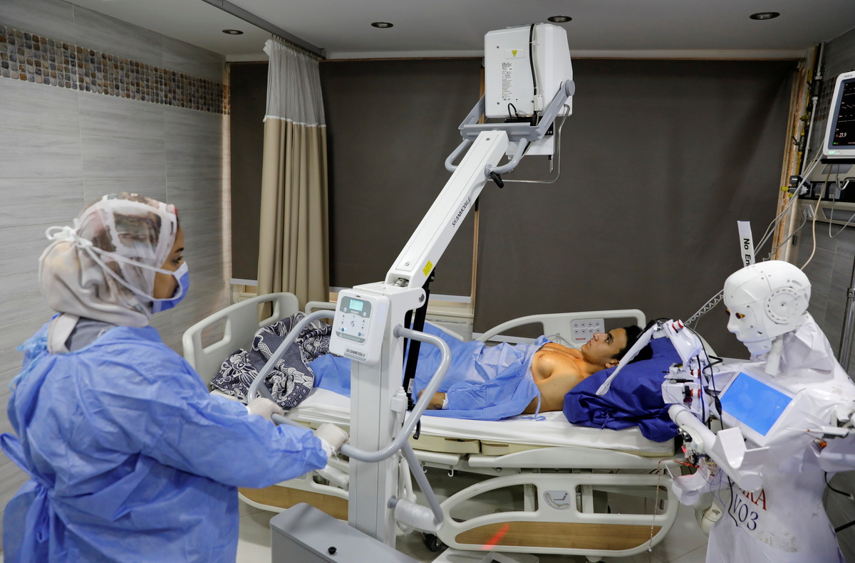 A volunteer is examined by Cira 3, a remote-controlled robot that runs tests on suspected coronavirus disease (COVID-19) patients to limit the human exposure to the virus, amid a second wave of infections in Tanta, Egypt, November 18, 2020. Picture taken November 18, 2020. REUTERS/Mohamed Abd El GhanyCira 3, a remote-controlled robot that runs tests on suspected coronavirus disease (COVID-19) patients to limit the human exposure to the virus is seen next to a healthcare worker in a corridor of the hospital, amid a second wave of infections in Tanta, Egypt, November 18, 2020. Picture taken November 18, 2020. REUTERS/Mohamed Abd El Ghany