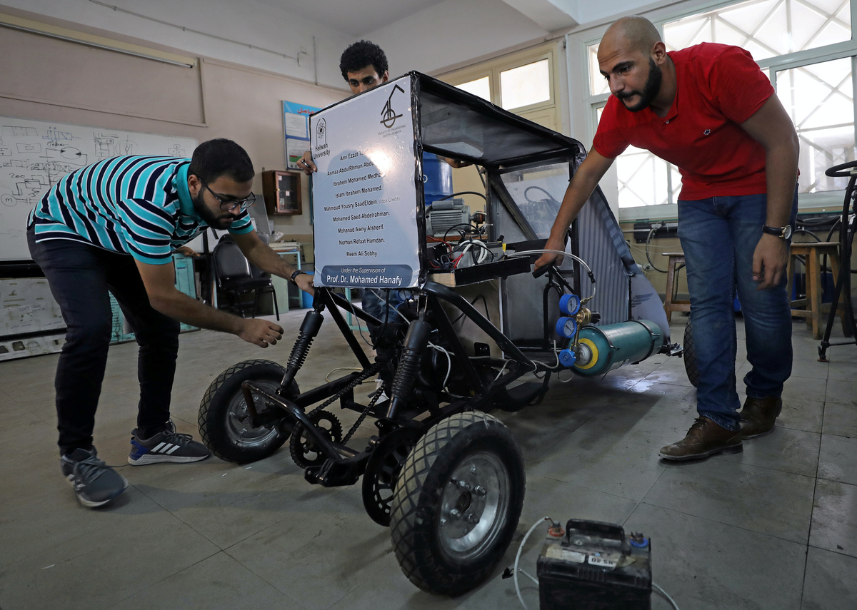 The students say their vehicle can hit 40 kilometers an hour and last 30 kilometers before needing to be refueled, and it only costs about 18,000 Egyptian pounds ($1,008.40) to build.
