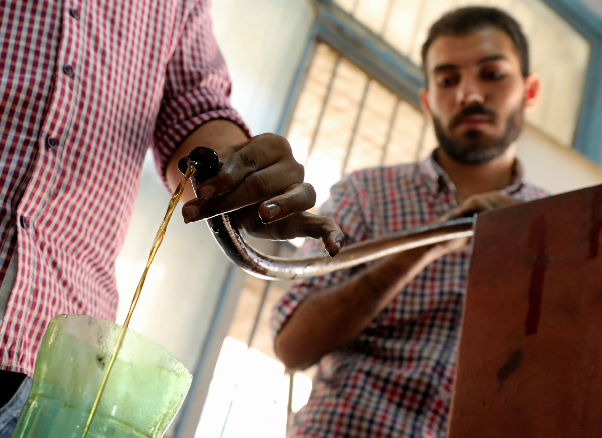 Diesel oil seen dripping out of container after extraction from burning car tires Cairo, Egypt August 23, 2017. REUTERS/Mohamed Abd El Ghany