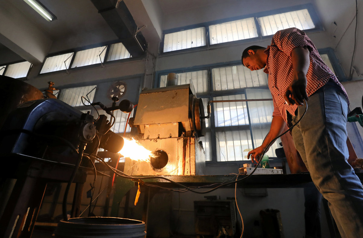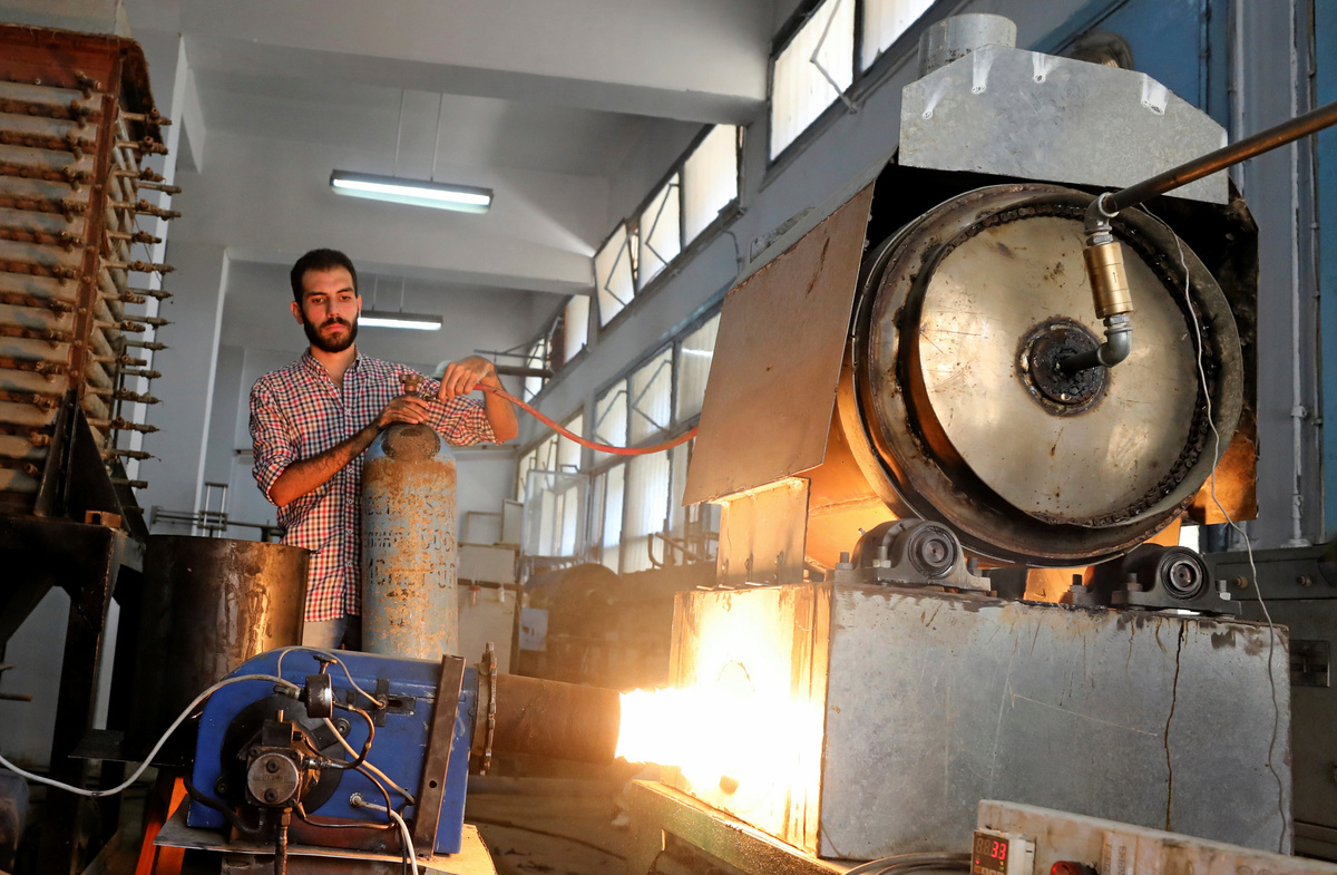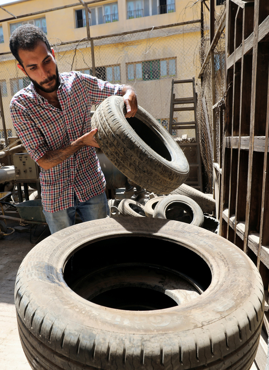 Engineering students, Mostafa Saeed Ali and Mohamed Amr cut up car tires in Cairo, Egypt August 23, 2017. REUTERS/Mohamed Abd El Ghany