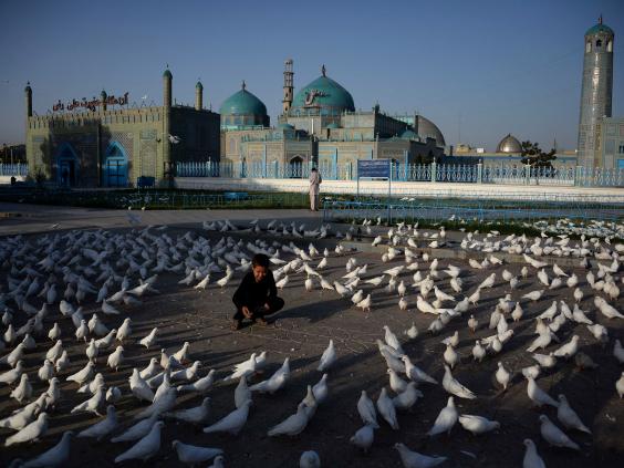 An Afghan boy feeds pigeons at the Hazrat-i- Ali shrine in Mazar-i Sharif on September 12, 2016 (Getty)