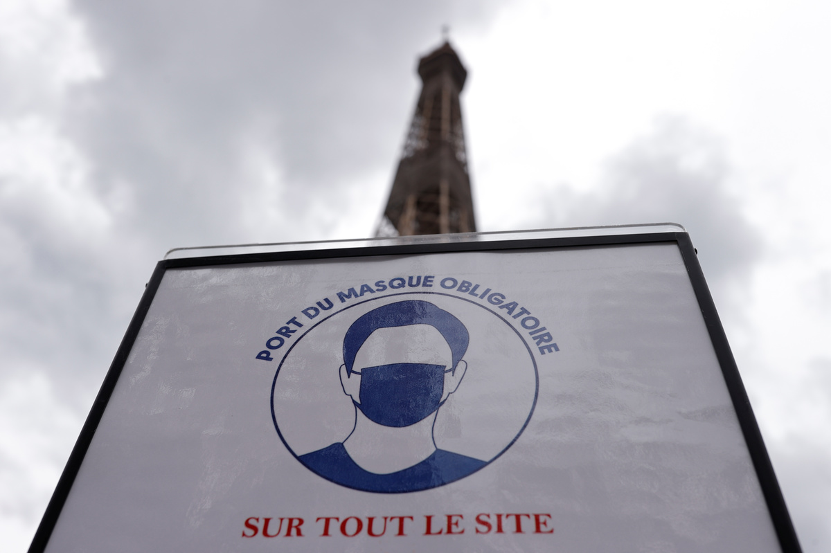 A sign that reads, "Mandatory to wear a mask on all the site", is seen at the entrance of the Eiffel Tower as she gets ready to re-open to the public following the coronavirus outbreak, in Paris, France, June 17, 2020. REUTERS/Christian Hartmann