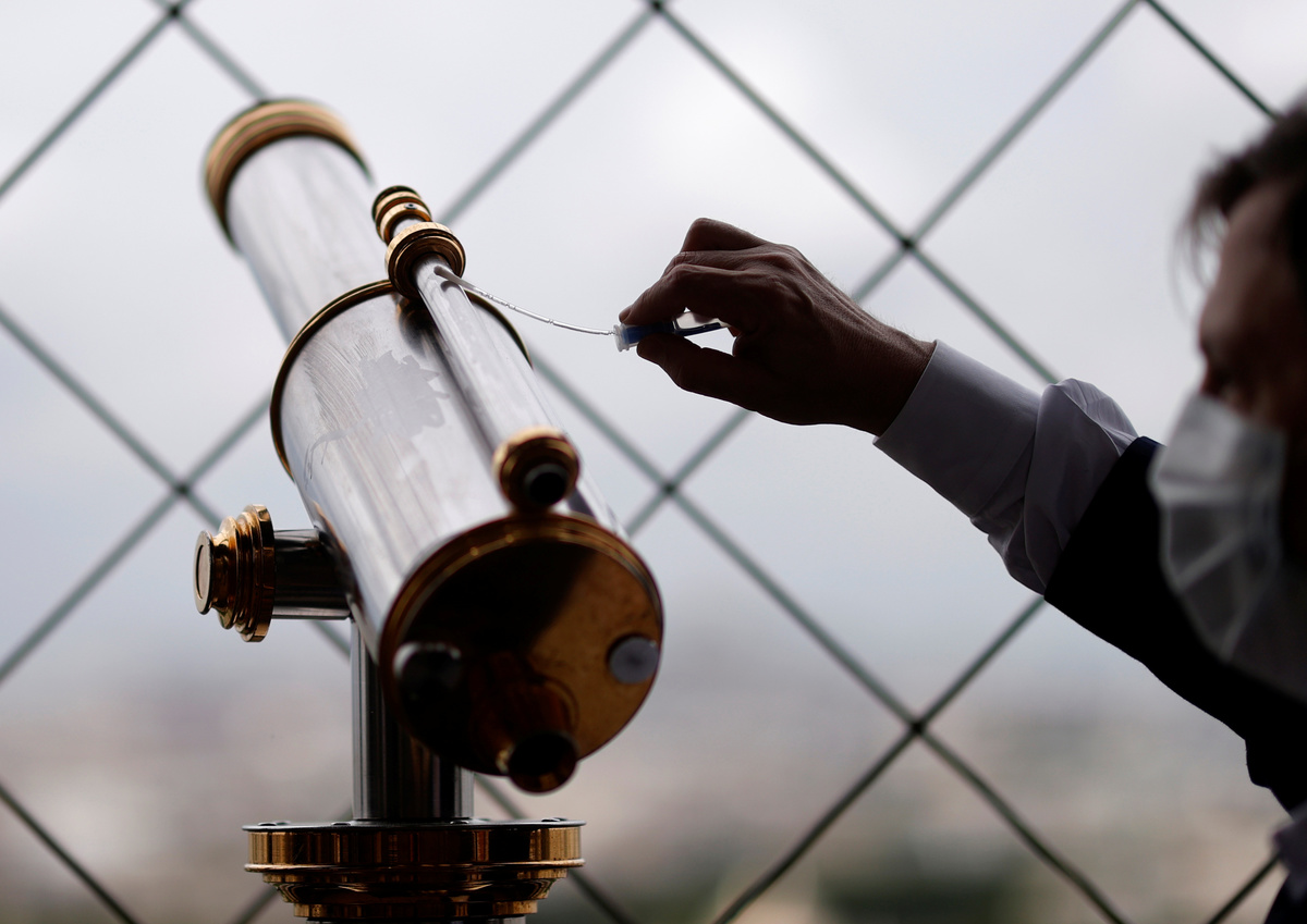 A sign that reads, "Mandatory to wear a mask on all the site", is seen at the entrance of the Eiffel Tower as she gets ready to re-open to the public following the coronavirus outbreak, in Paris, France, June 17, 2020. REUTERS/Christian HartmannSigns reminding about social distancing is seen at the Eiffel Tower as she gets ready to re-open to the public following the coronavirus outbreak, in Paris, France, June 17, 2020. REUTERS/Christian HartmannSigns reminding about social distancing is seen at the Eiffel Tower as she gets ready to re-open to the public following the coronavirus outbreak, in Paris, France, June 17, 2020. REUTERS/Christian HartmannSigns reminding about social distancing is seen at the Eiffel Tower as she gets ready to re-open to the public following the coronavirus outbreak, in Paris, France, June 17, 2020. REUTERS/Christian HartmannA general view shows the Eiffel Tower as she gets ready to re-open to the public following the coronavirus outbreak, in Paris, France, June 17, 2020. REUTERS/Christian HartmannCleanliness and hygiene expert Alain Miralles uses an swab to ensure that a telescope is clean as the Eiffel Tower gets ready to re-open to the public following the coronavirus outbreak, in Paris, France, June 17, 2020. REUTERS/Christian Hartmann
