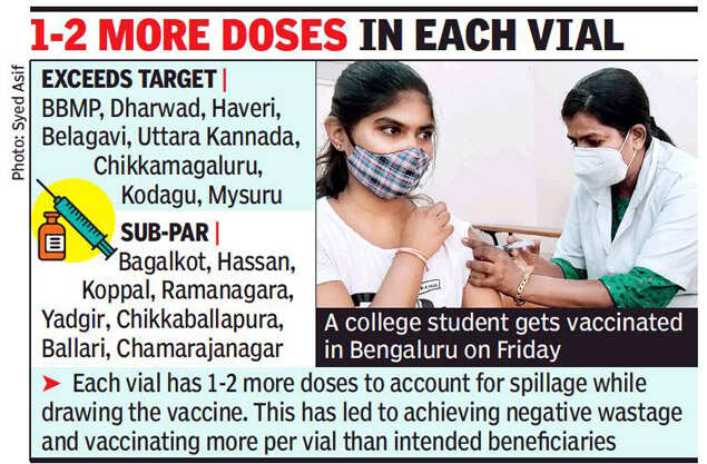 BENGALURU: Eight districts in Karnataka have achieved negative wastage of Covid-19 vaccines with healthcare workers carefully using each vial to inoculate more than the allocated 10 or 20 people.