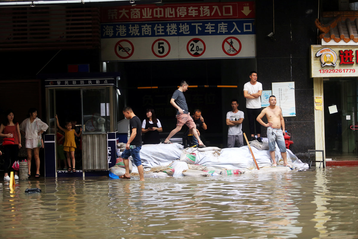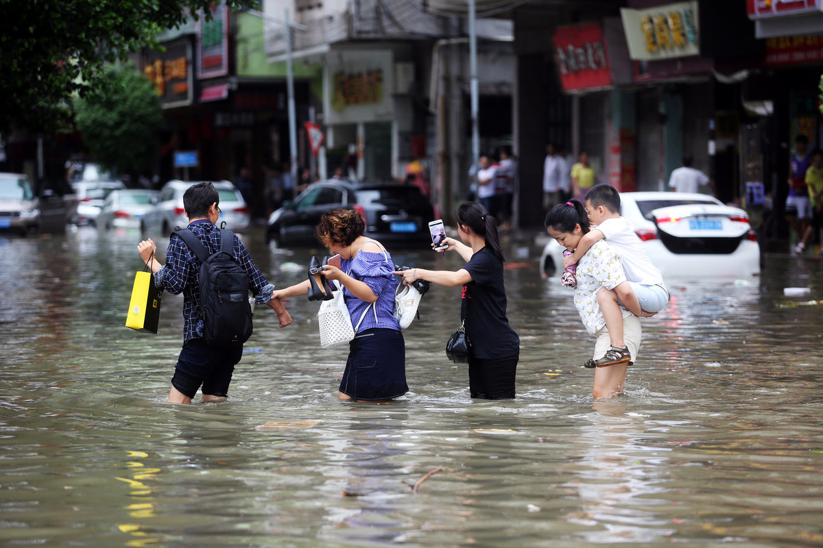 People walk through a flooded street as Typhoon Hato hits Dongguan, Guangdong province, China.