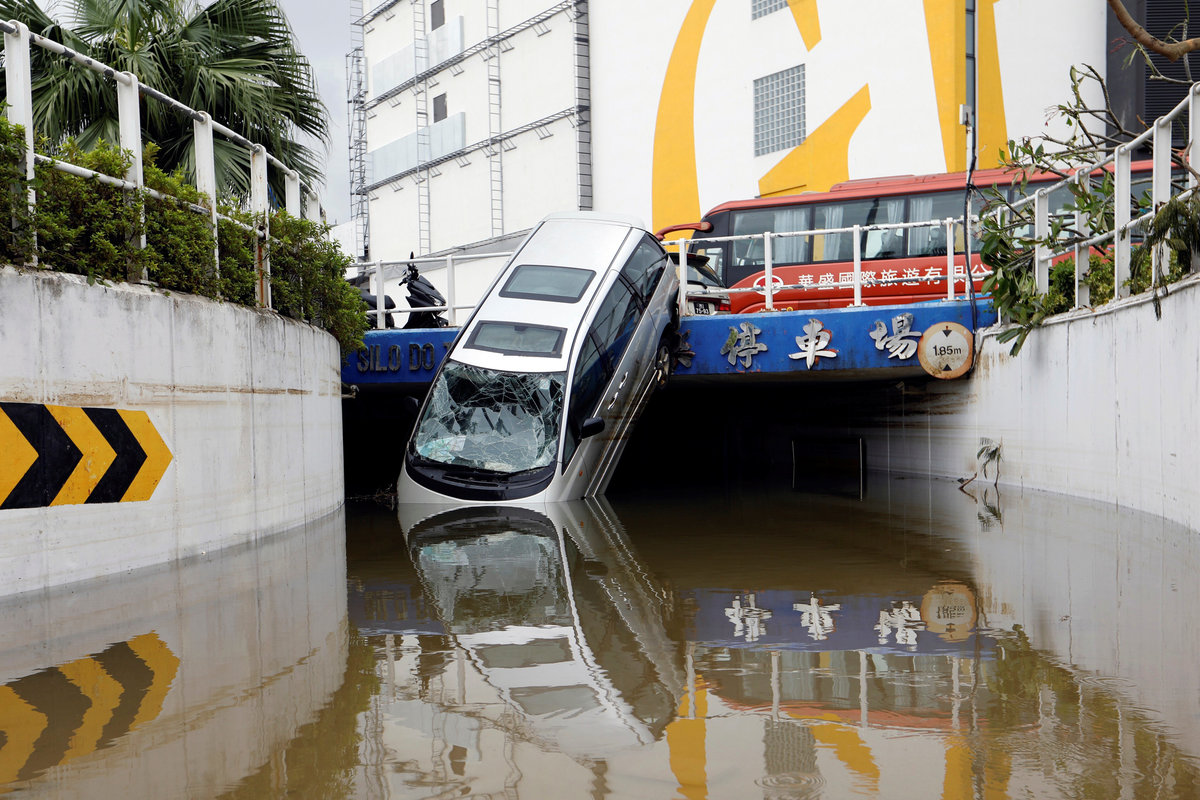 Video footage sent by Macau residents to Reuters showed a man struggling to keep his head above water in an enclosed car park filled with debris, a truck toppling over and pedestrians flung across pavements.