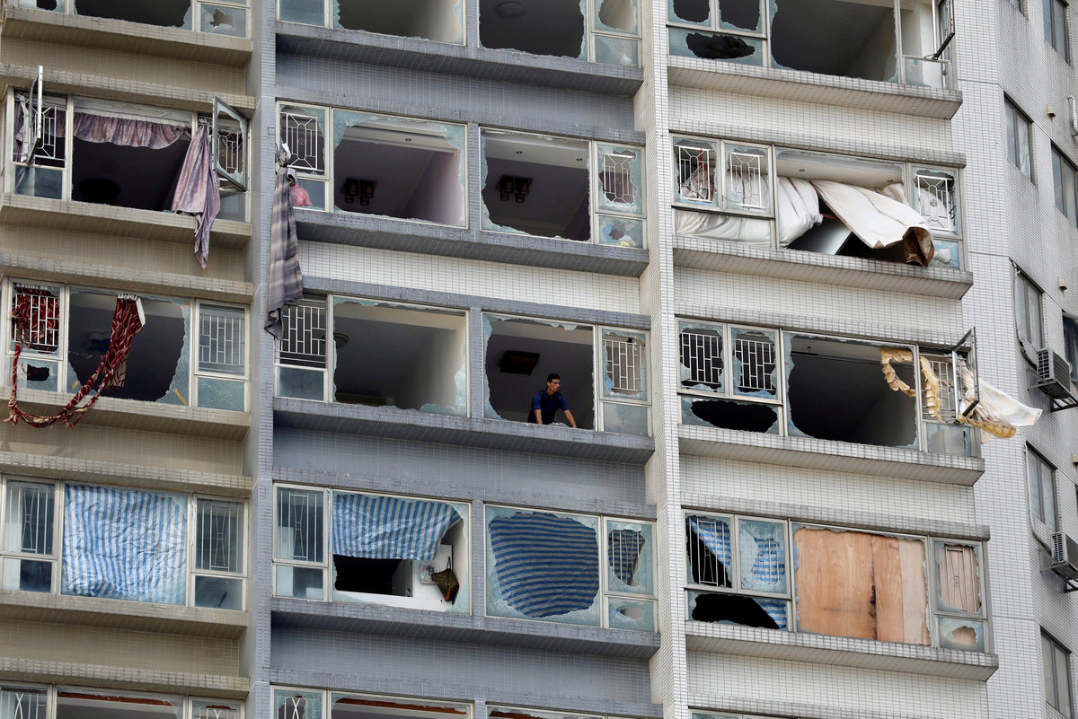 A man looks out from inside an apartment where some windows have been broken by typhoon Hato in Macau.