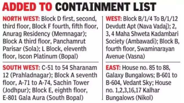 Among the newly added micro-containment zones, five are located in West Zone areas such as Nava Vadaj, Ambawadi, Vasna and Ranip while four residential societies are located in South West Zone in areas like Makarba, Jodhpur and South Bopal. Three of the societies are in Bodakdev and Sola in North West Zone.
