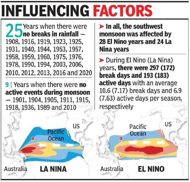During El Nino years, there were 297 break days as against 172 during La Nina years, 193 active days, as compared to 183 during La Nina. “This works out to an average of 10.6 El Nino break days and 7.17 La Nina break days and 6.9 El Nino and 7.63 La Nina active days per season respectively,” Kumar, a meteorologist stated.