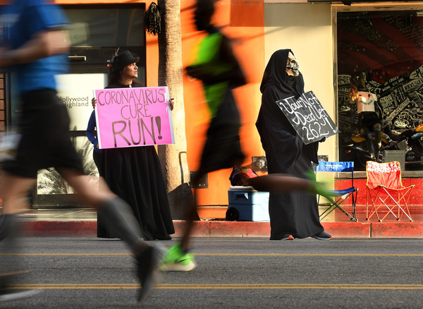 One L.A. Marathon spectator donned a hazmat suit. Another, in a Grim Reaper costume, handed out candy. Runners traded sneaker taps instead of high-fives, and race volunteers wore latex gloves when offering water.