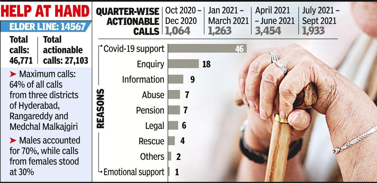 In Telangana, the helpline received 46,771 calls between October 2020 and September 2021. Maximum calls to the helpline came from Hyderabad, Rangareddy and Medchal Malkajgiri, accounting for 64%. Covid-related queries (47%) were at the top of the list, while many others called up to report abuse, pension problems and plea for rescue. However, only 1% callers dialled the number for emotional support. Men accounted for nearly three-fourths of the calls, seeking information or help.