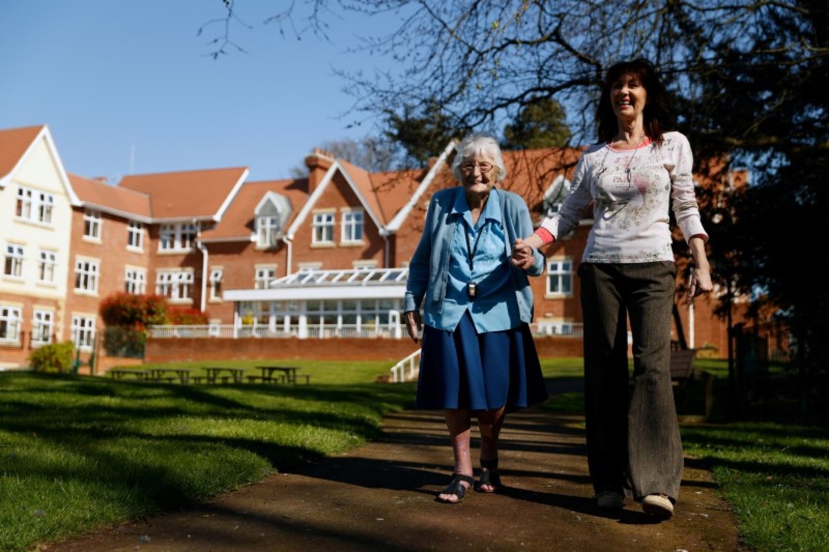 Resident Enid Roche takes a walk in the grounds of Foxholes Care Home, assisted by activities director Susan Davies as the spread of the coronavirus disease (COVID-19) continues, Hitchin, Britain March 25, 2020. Picture taken March 25, 2020. REUTERS/John Sibley