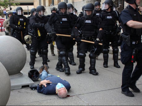 Mr Gugino’s lawsuit states that shortly after the curfew began, the officers covering the protest “yelled out in chorus, ‘push him, push him’” when the 75-year-old approached a line of them.