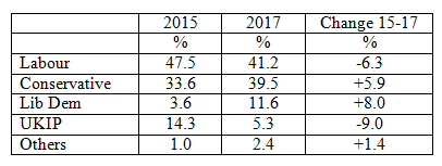 Let us invent a constituency and call it Yellow Town Central. The table below sets out the results in 2015 and in the 2017 general election in this constituency.