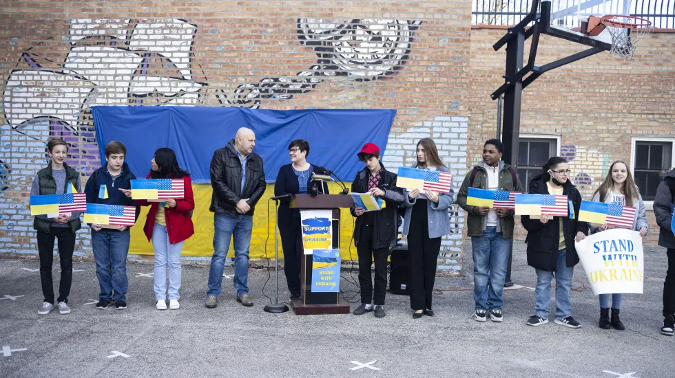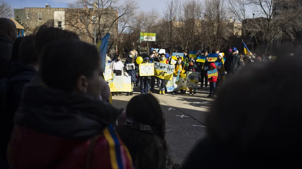 Christina, 12, a sixth-grader at Columbus Elementary School, 1003 N. Leavitt St., joined her mother as dozens of classmates, parents and teachers waved flags and hoisted signs in support of the Ukrainian community in an after-school rally Thursday.
