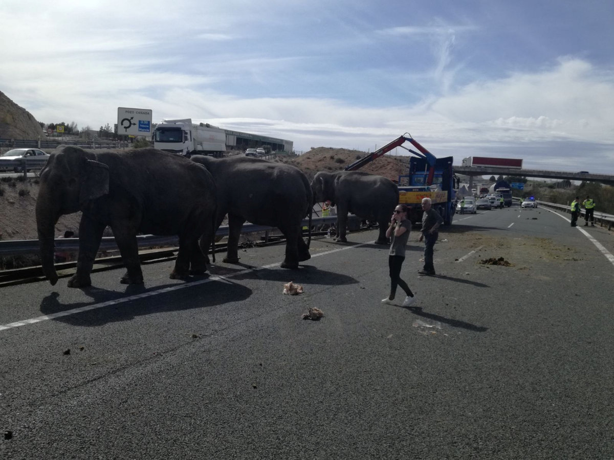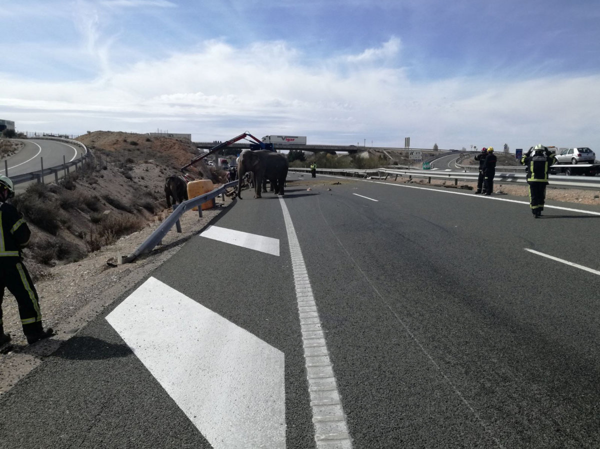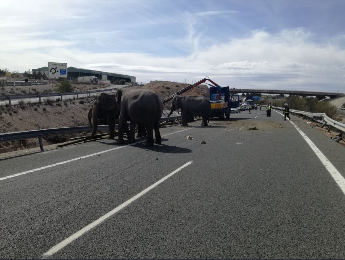 "Our Albacete traffic comrades today, attending to some elephants who were victims of an accident in Pozo Canada (unfortunately one of the pachyderms died)."