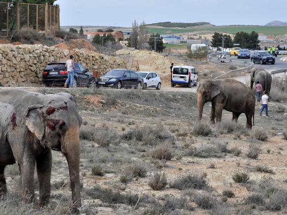 The four surviving elephants wandered the road in Pozo Canada, in the province of Albacete, which was forced to close.