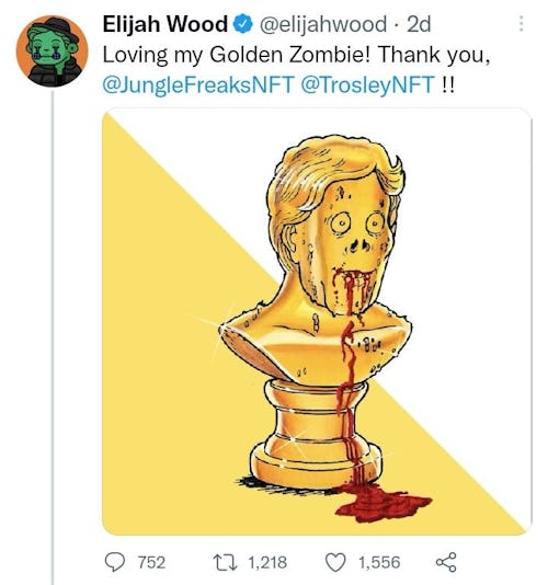The Lord of the Rings star is a committed collector of NFT art, and the work he posted about — a golden bust of a zombie — seemed innocuous enough. “Loving my Golden Zombie!” he said in a since-deleted tweet. “Thank you, @JungleFreaksNFT @TrosleyNFT !!”
