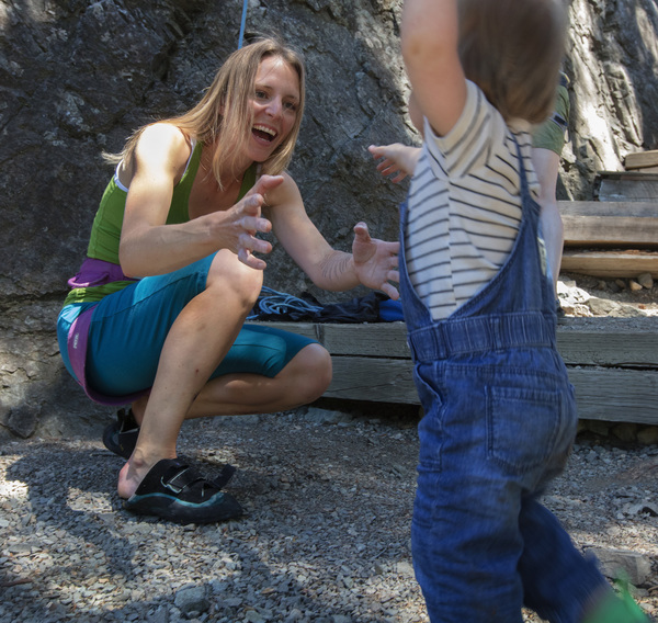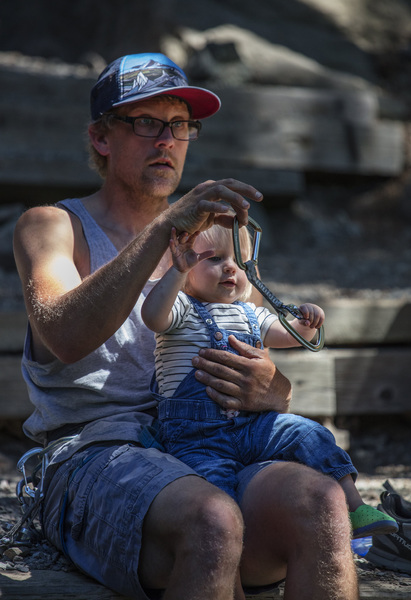 And, of course, in addition to your own climbing gear and sustenance, you have to pack in toddler snacks and water, and some form of kid distraction. One trick: Shiny carabiners and quickdraws make great baby rattles.