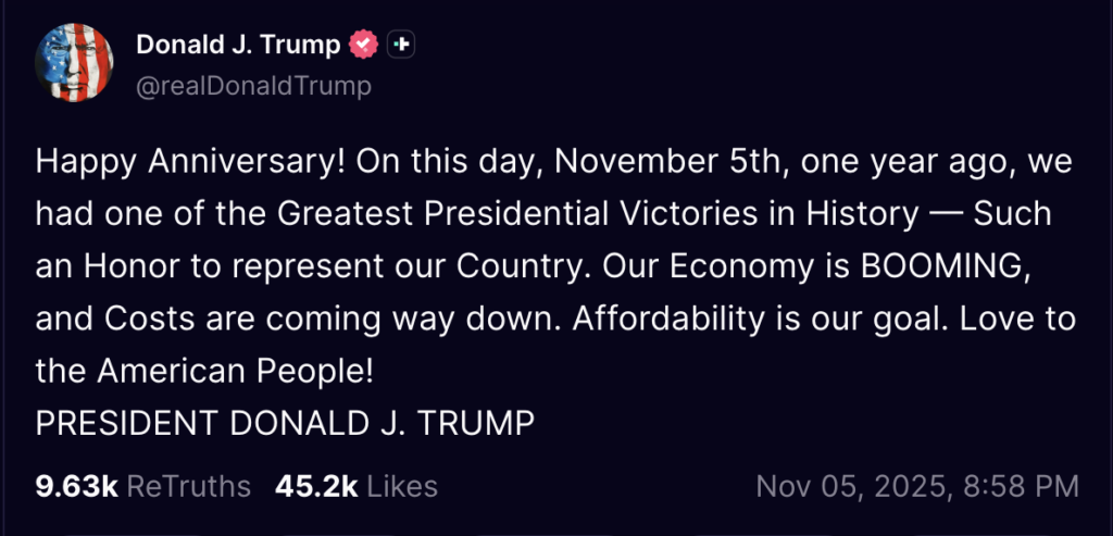 President Trump celebrated the anniversary of his 2024 election victory with a string of triumphant posts on Truth Social, calling it "one of the greatest presidential victories in history."