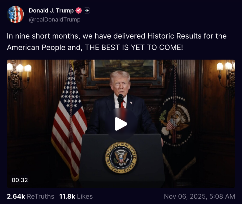 He declared, "Our Economy is BOOMING, and Costs are coming way down. Affordability is our goal," while promising that "THE BEST IS YET TO COME!"