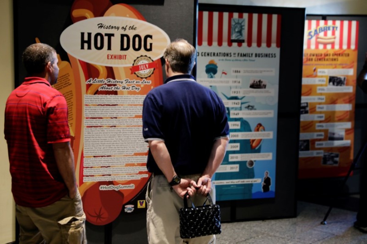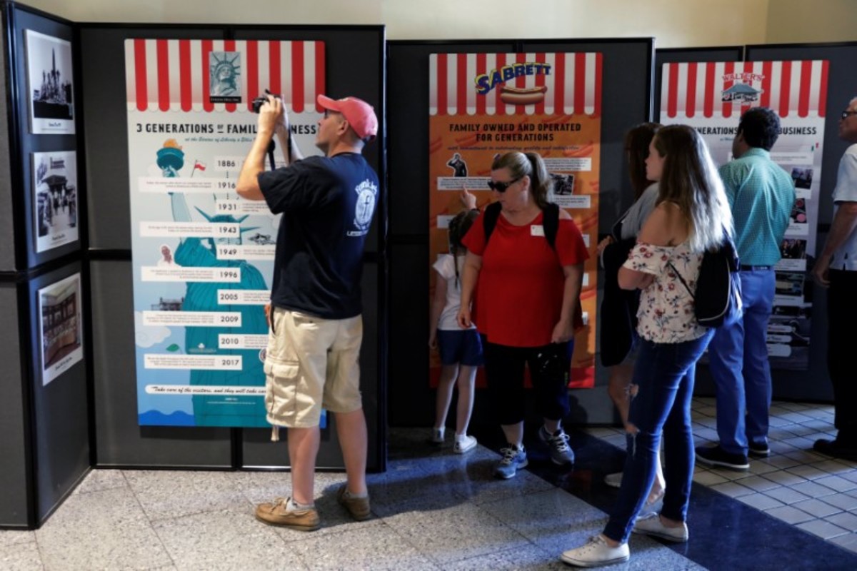 Attendees look at a newly opened exhibit at Ellis Island highlighting the immigrant history behind the "Hot Dog" in New York City, U.S., June 28, 2017. REUTERS/Lucas Jackson