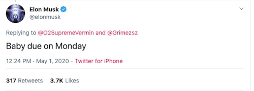 A reply buried in the neverending thread gives us (maybe) a hint about what's really going on. "Baby due on Monday," Musk tweeted to a well-wisher after first noting, "My gf @Grimezsz is mad at me." Who knows if that's actually true, but Musk certainly wouldn't be the first expectant father to lash out due to pre-baby panic — if that's even what's happening here.