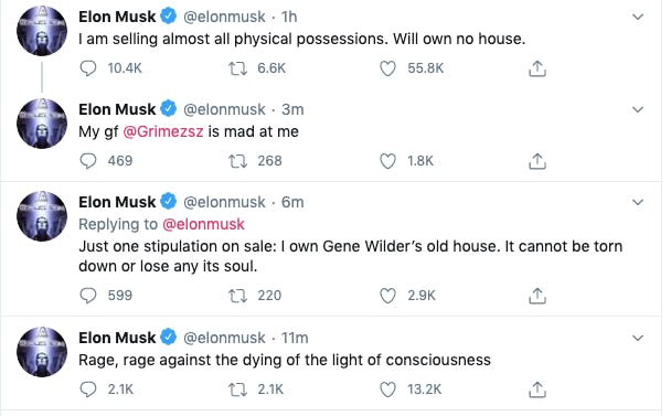 In his tweetstorm on Friday, Musk demanded, 'give people back their FREEDOM,' before launching into a Twitter rendition of the Star-Spangled Banner. He then shifted gears somewhat, tweeting a line from a Dylan Thomas poem made famous by its use in the movie Interstellar: "Rage, rage against the dying of the light." How original.