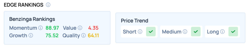 Tesla scores well on Momentum and Growth metrics, while offering satisfactory Quality, but poor Value. Tesla also offers a favorable price trend in the Short, Medium and Long term. For more such insights, sign up for Benzinga Edge Stock Rankings today!