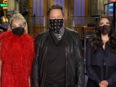 Musk – who is wearing a black bandana as a face mask – is seen standing between Cyrus and SNL regular Cecily Strong on the show’s set.
