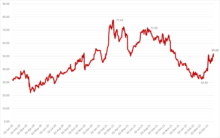 Some shareholders have complained that Musk’s $54.20 bid is too low. Twitter briefly traded above US$70 in July 2021 – in line with the rise of tech stocks generally in 2021, but it fell steadily thereafter to US$32.42. In February 2022, Goldman Sachs valued Twitter shares US$30 over the next 12 months based on its most recent earnings.
