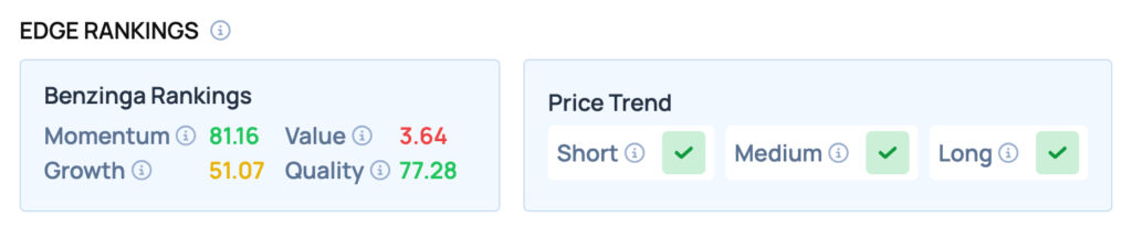 Tesla scores well on Momentum and Quality metrics, while offering satisfactory Growth, but poor Value. Tesla also has a favorable price trend in the Short, Medium, and Long term. For more such insights, sign up for Benzinga Edge Stock Rankings today!