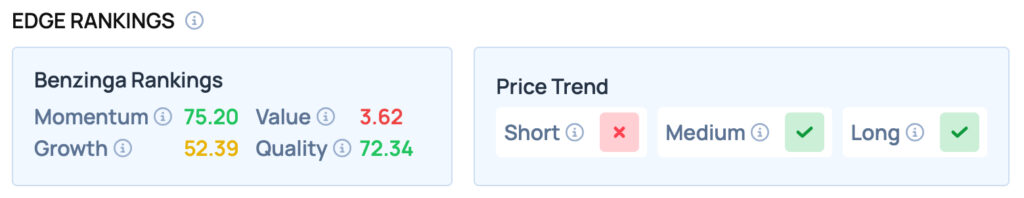 Tesla scores well on Momentum and Quality metrics, while offering satisfactory Growth, but poor Value. Tesla also has a favorable price trend in the Medium and Long term. For more such insights, sign up for Benzinga Edge Stock Rankings today!