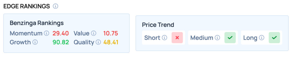 Tesla offers poor Momentum and Value, while scoring well on the Growth metric and offering satisfactory Quality. For more such insights, sign up for Benzinga Edge Stock Rankings today!