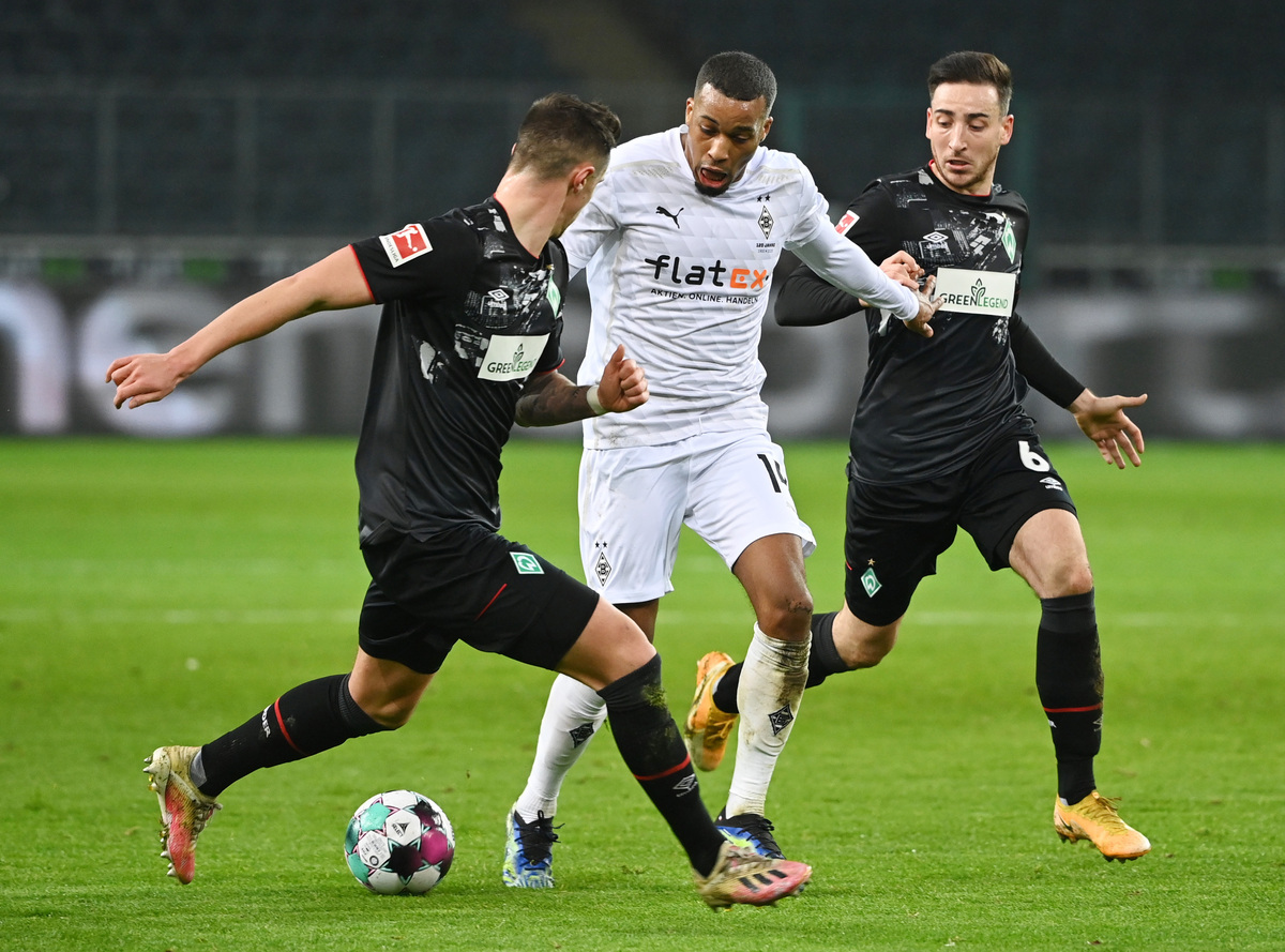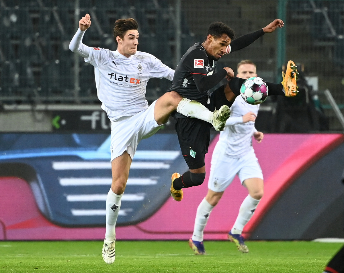 Soccer Football - Bundesliga - Borussia Moenchengladbach v Werder Bremen - Borussia-Park, Moenchengladbach, Germany - January 19, 2021 Werder Bremen's Marco Friedl in action with Borussia Moenchengladbach's Alassane Plea Pool via REUTERS/Ina Fassbender