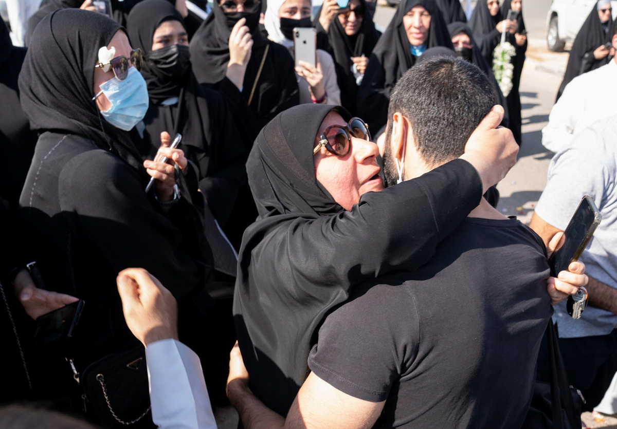 Women threw flower petals as more than 10 prisoners were seen exiting a bus in a parking lot outside the central prison, where more than 200 relatives and friends gathered to meet them, embracing amid chants of "There is no god but God".