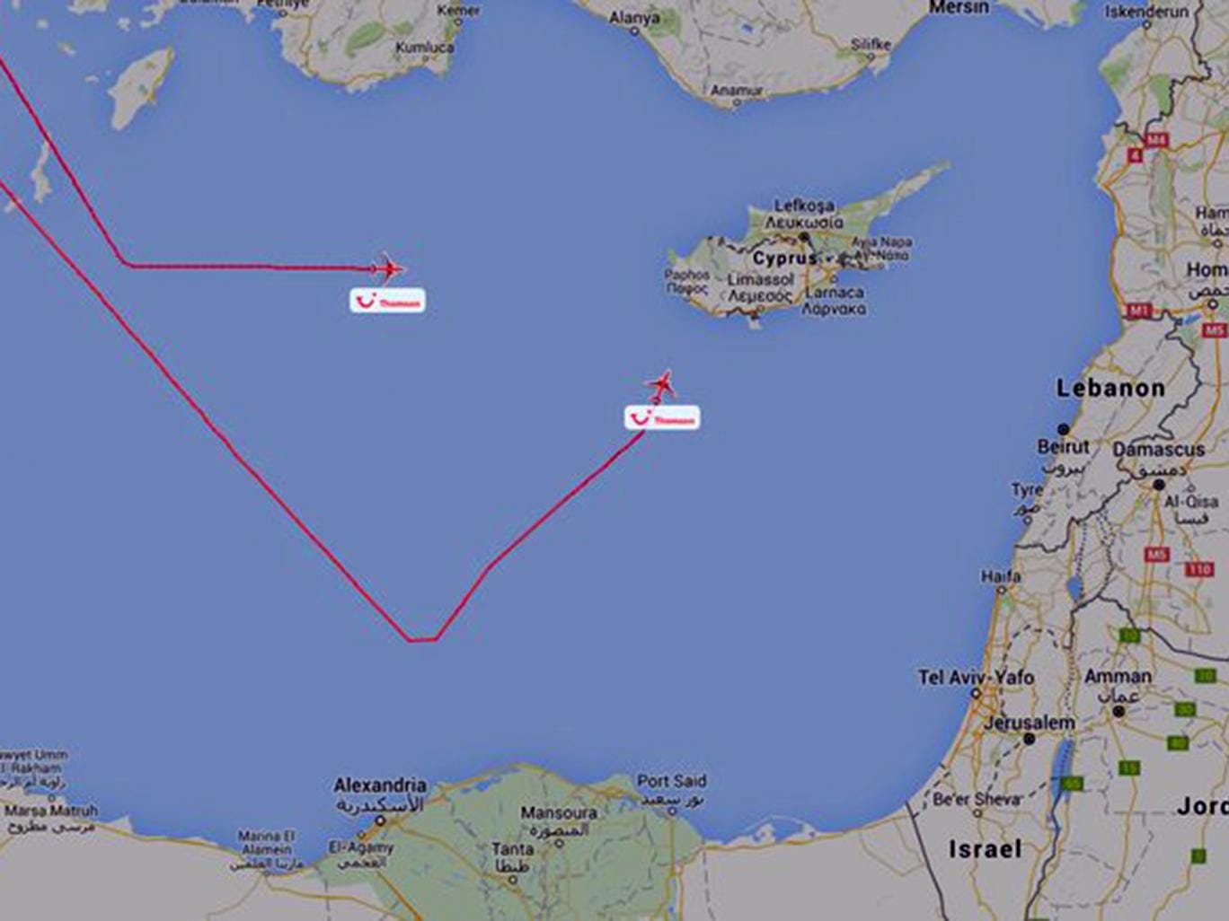 Online flight trackers showed a Thomas Cook flight turned around in mid-air over northern Greece on its way to pick up British citizens in Egypt:
