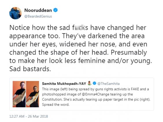 “The right is passing around a photoshopped clip and pic of Emma Gonzalez tearing up the Constitution (she actually tore up a shooting range target),” wrote Hurst4Spd. “What this tells you is that they have no response to the substance of her message. So they've decided to lie about her instead.”
