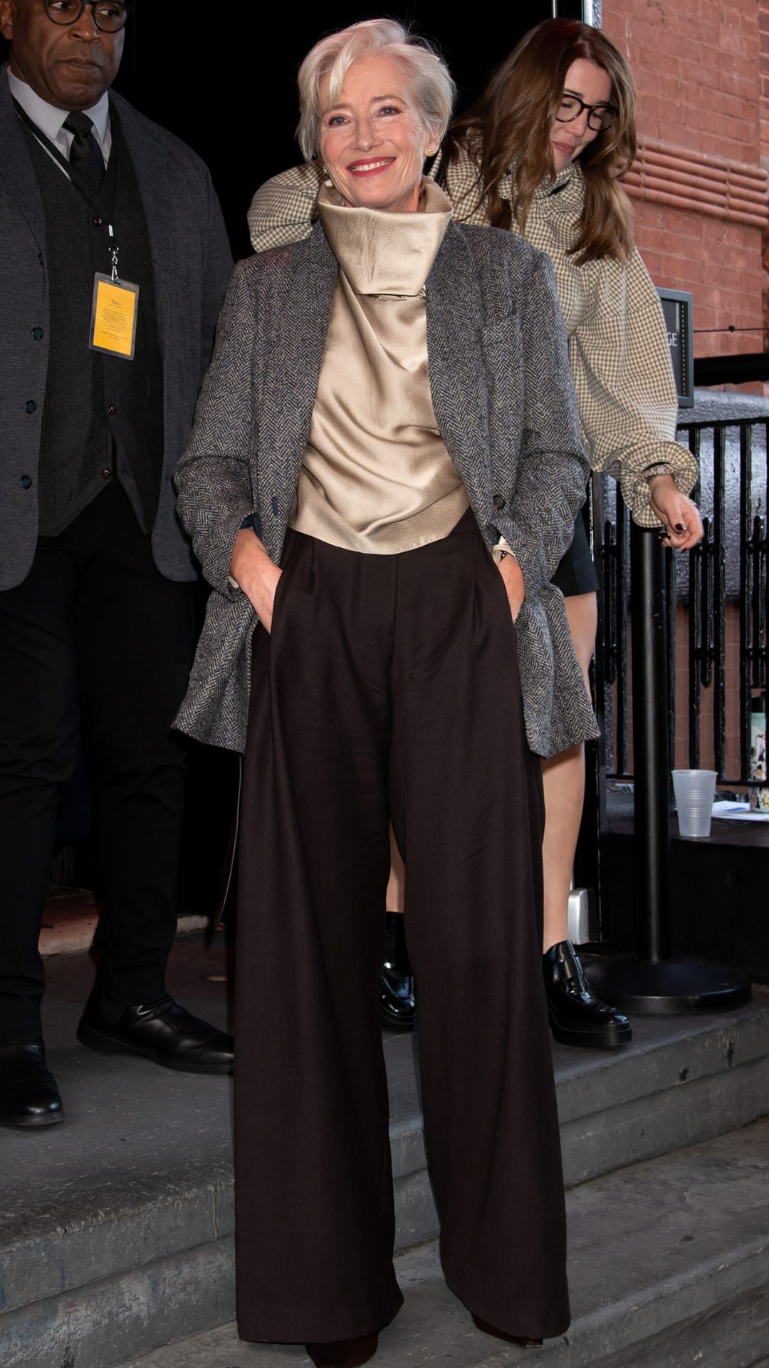 I have been wearing my autumnal-coloured separates with fresh white, soft grey and other shades of brown, but after seeing Emma Thompson’s latest look, I’m very tempted to team my chocolate with a splash of champagne. The actress looked amazing while out in New York last week, wearing a pair of dark brown trousers with a creamy-gold satin blouse, and the unexpected colour pairing was absolute perfection.