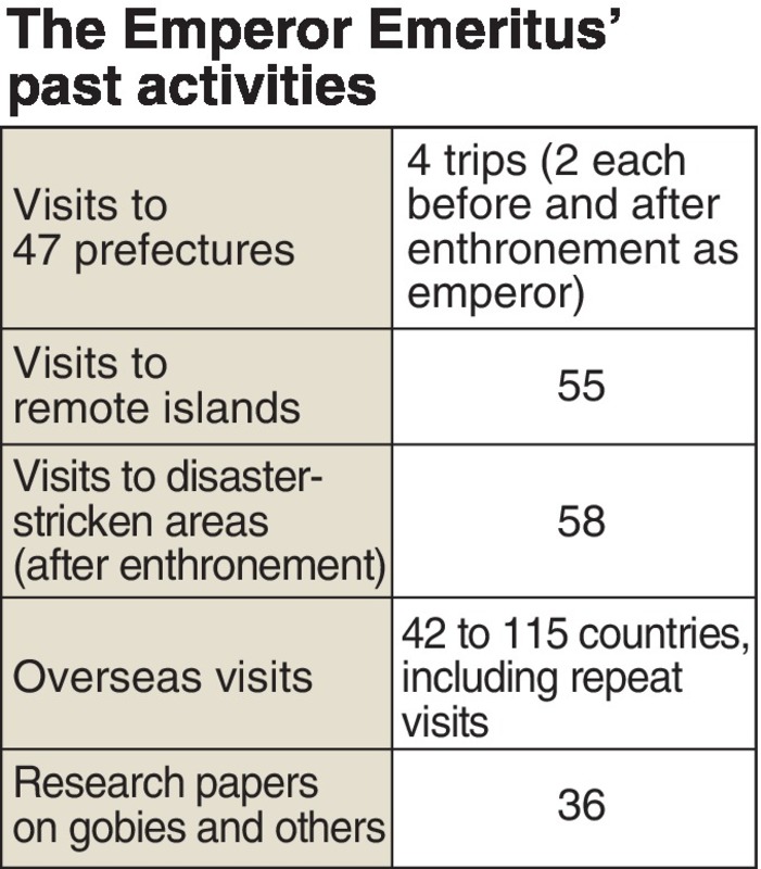 The Emperor Emeritus visited disaster-stricken areas 58 times after he was enthroned as the emperor, and made 42 overseas trips to 115 countries, with some repeat visits, including during his time as the crown prince. He is said to express concern, happiness or other emotions about people whom he met on visits and other occasions whenever he comes across them in newspaper articles.