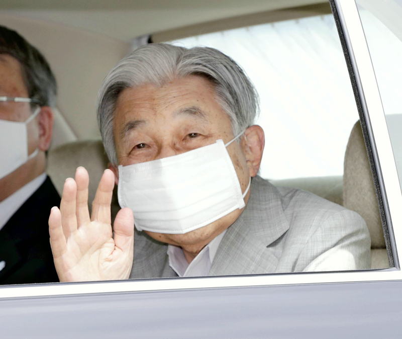 Wearing a face mask, the Emperor Emeritus left the Takanawa residence in a car shortly before 10 a.m. and waved from inside the vehicle to people along the road.