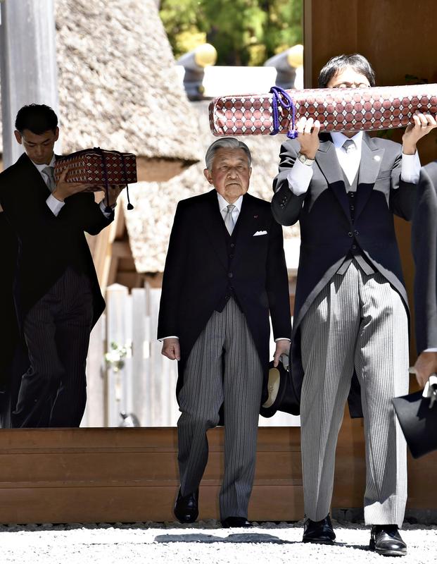 The Emperor formally reports his April 30 abdication at the Geku outer shrine at Ise Jingu in Ise, Mie Prefecture, on Thursday. The shrine visit was an abdication-related ritual called "Jingu ni Shinetsu no Gi." Dressed in a morning coat, the Emperor walked down a path to the Shoden hall with chamberlains in front and behind carrying the sacred sword and jewel -- two of the three sacred treasures of the Imperial family. The Emperor then presented an offering of a tamagushi tree branch and bowed. The Empress followed suit.