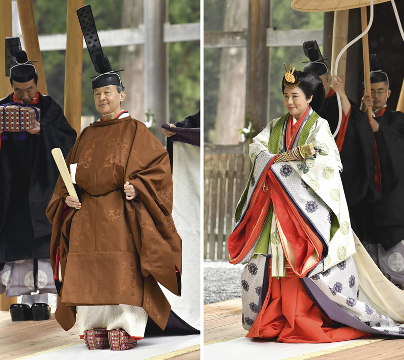 ISE, Mie -- The Emperor and Empress on Friday began the two-day Jingu-ni-Shinetsu-no-Gi ceremony to formally report his enthronement at the Ise Jingu shrines in Ise, Mie Prefecture.