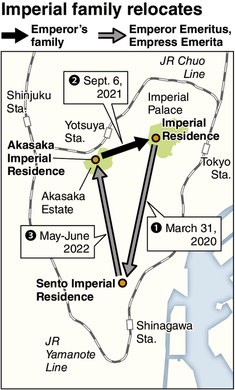 All their belongings will be transferred to their new residence -- where the Emperor Emeritus and Empress Emerita lived until March last year -- by Sept. 15. Until that time, the Emperor's family will stay in the Kyuden within the Imperial Palace grounds.